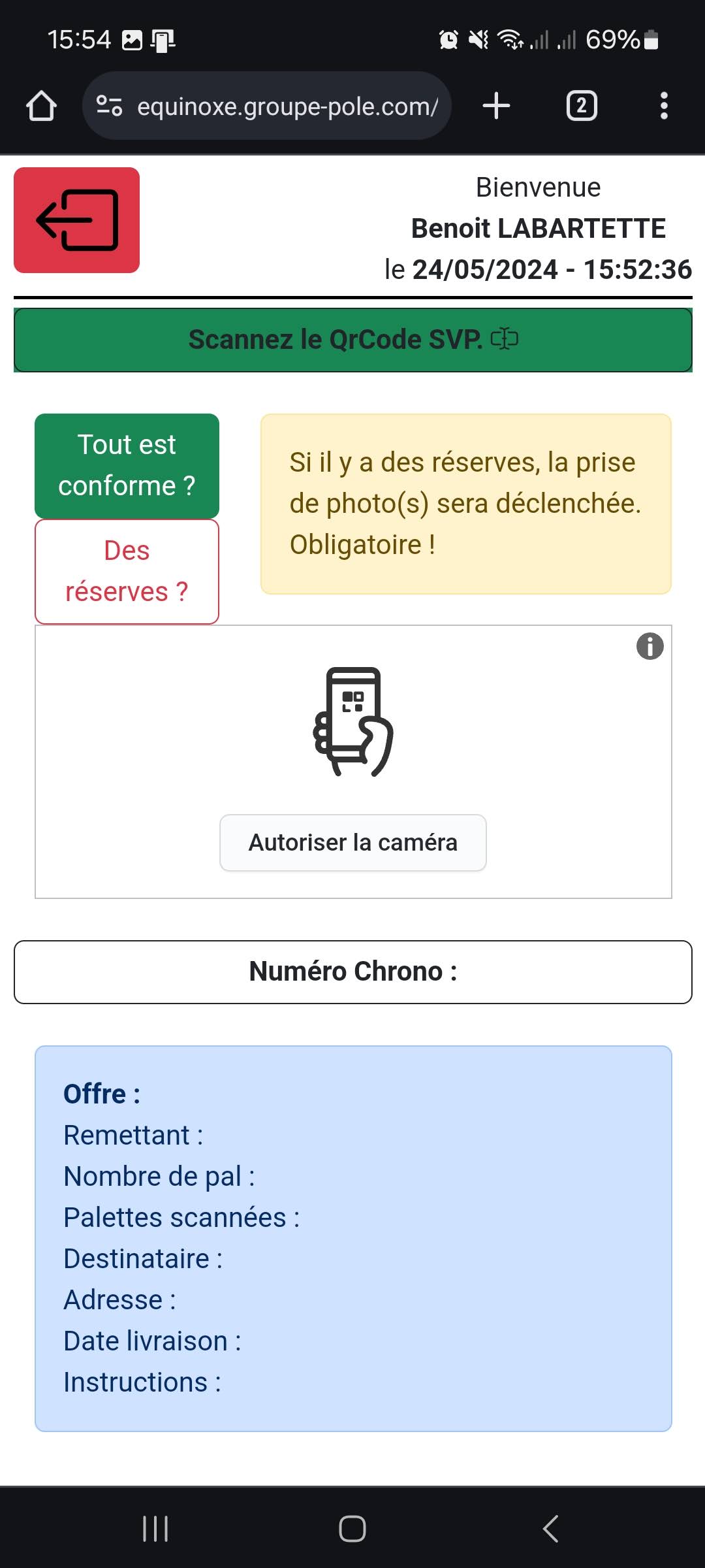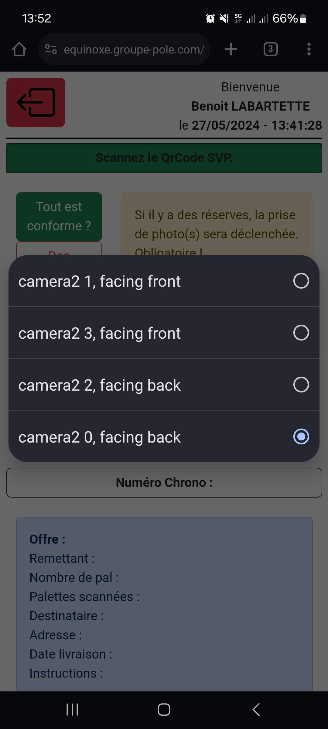 Vous constatez que l’appareil photo s’est déclenché et maintenant l’application est prête pour scanner les QrCodes POLE.